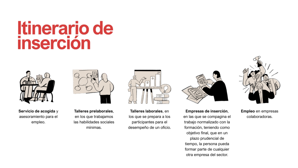 • Empresas de inserción, en las que se compagina el trabajo normalizado con la formación, teniendo como objetivo final, que en un plazo prudencial de tiempo, la persona pueda formar parte de cualquier otra empresa del sector.